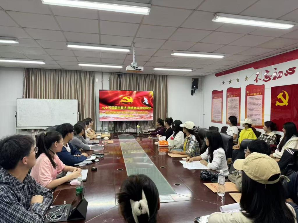 2024年10月15日,公司员工党支部在金家岭校区二号实验楼214会议室举办“七十五载同舟共济,团结奋斗共创伟业”时事宣讲。“雁阵行”宣讲团成员茅玲苑担任主讲,2024年秋季学期全体党员发展对象和入党积极分子参加本次的宣讲活动。