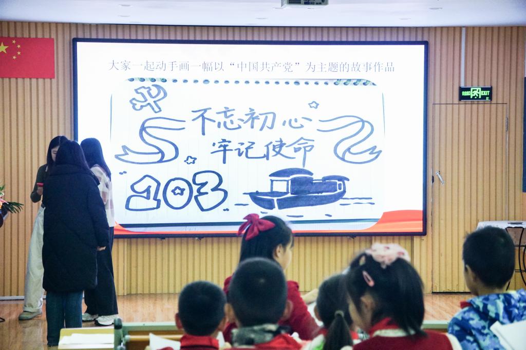 共绘新中国,党恩润童心。员工党支部成员李同结合动画视频,以“中国共产党的成立”为主题的例画做示范,带领小员工们一同绘制了简笔画。通过绘画创作,小员工们对党的初心和使命有了更多了解,并借机会此分享了自己心目中党的光辉形象。
