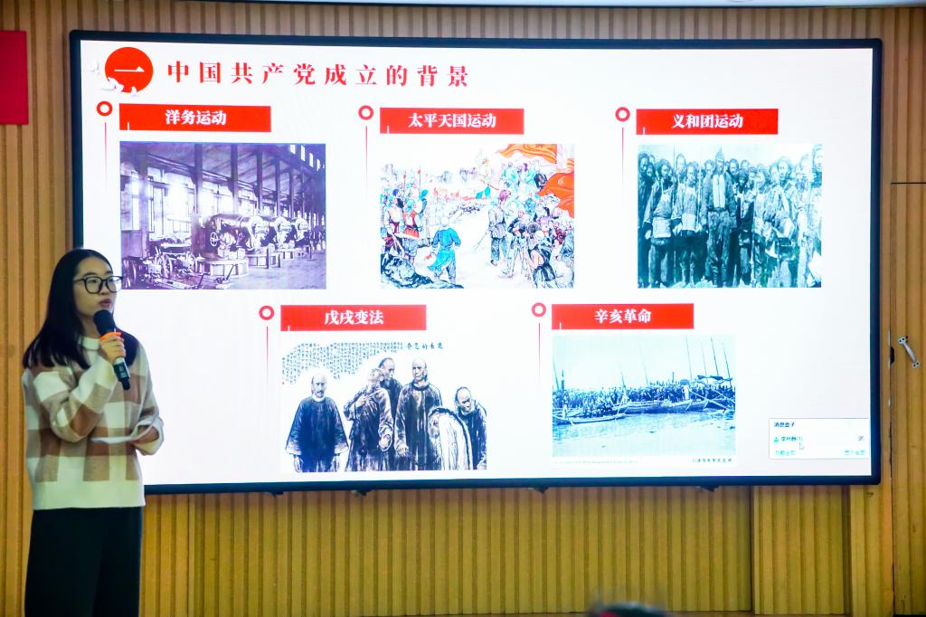 不忘初心跟党走,砥砺前行向未来。员工党支部成员陈景蓉以时间为线索,讲述了中国共产党成立的时代背景和思想基础,阐释了党在奋斗历程中形成的“红船精神”的深刻内涵。随后,陈景蓉以播放红色动画短片《跟着那兔学党史:开会!建党!》《那年那兔那些事:新的征程》的形式向小员工们普及了党史知识,并组织了互动问答。她鼓励同学们牢记历史,继承和发扬“红船精神”,勇于面对未来的挑战,刻苦学习,增长才干,为祖国的建设贡献自己的力量。