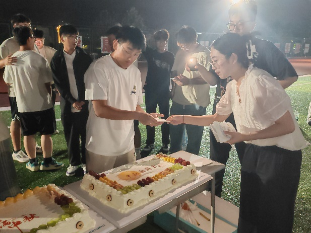 晚会尾声,张伟暖心地为同学们准备了写有名字的蛋糕、月饼、花露水以及风油精,与王嘉伟、商玉坤依次将其分发给每一位同学。这份装满沉甸甸爱意的礼物让大家感受到了家人一般的关怀。