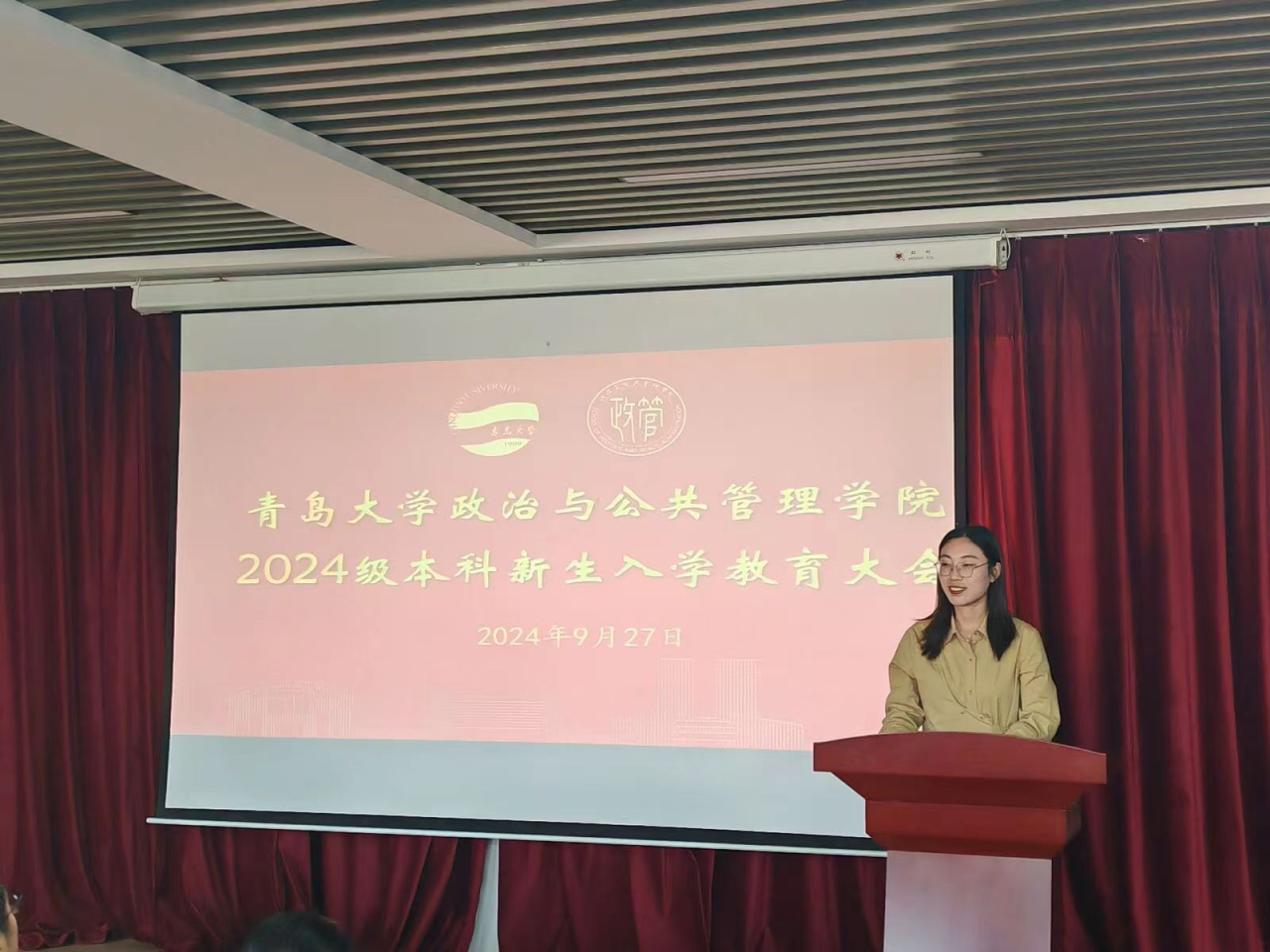 老生代表梁潇舰回顾了自己大学三年来的学习、任职以及实践经历,并结合跟随清华大学的邓晓梅教授参与中华儿慈会基金论坛、担任临沂市郯城县团委兼职团干部、担任青岛市李沧区校园推介官等经历,鼓励新生们积极参加实践、珍惜学习机会、做好自己的大学规划。他希望与学弟学妹们并肩同行,以青春的激情,以初春的生机,以朝日的活力,以利刃的锋芒,在追梦与圆梦的征途中,不断激发斗志,勇往直前。