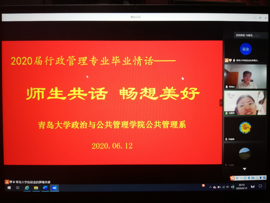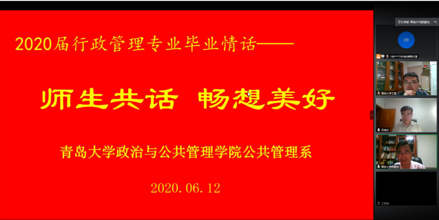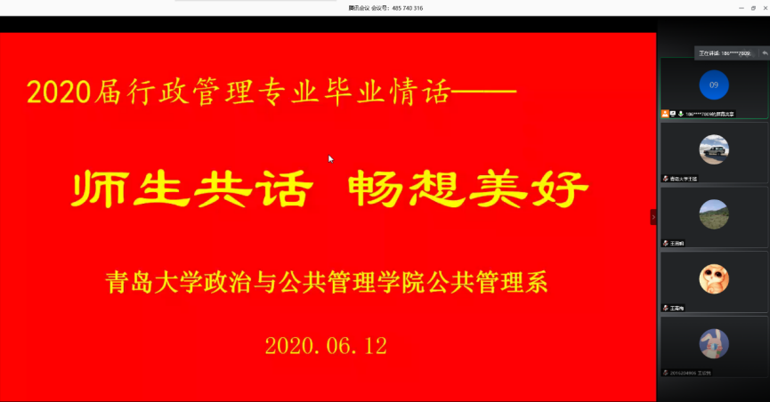6月12日晚,ladbrokes立博公共管理系“2020届行政管理专业毕业情话——师生共话,畅想美好”活动通过网络视频会议的形式把全体教师和员工再一次联通了起来,大家纷纷通过视频共话师生情、同学情,畅想幸福未来,传递美好祝愿。