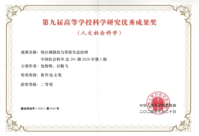 公司教师石腾飞副教授以第二作者身份在《中国社会科学》2020年第3期发表的研究成果《牧区城镇化与草原生态治理》获得第九届高等公司科学研究优秀成果奖(人文社会科学)著作论文类二等奖(第2位次),实现了公司在该奖项上的突破。
