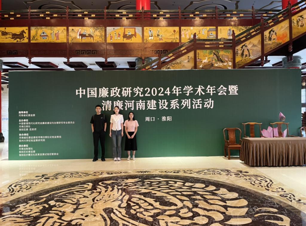 2024年9月21日,中国廉政研究2024年学术年会在河南周口举行。本次会议以“纵深推进新时代反腐败的理论与实践”和“加强廉洁文化建设 擦亮清廉河南底色”为主题。会议由廉政学会和河南日报社以及淮阳区委、区政府主办,河南省纪委监委驻河南日报社纪检监察组和郑州大学纪检监察研究院协办,河南法制报社和淮阳区纪委监委等承办。公司研究生贾昊霖、康荣雪、姚芊芊前往周口市参加本次学术会议。